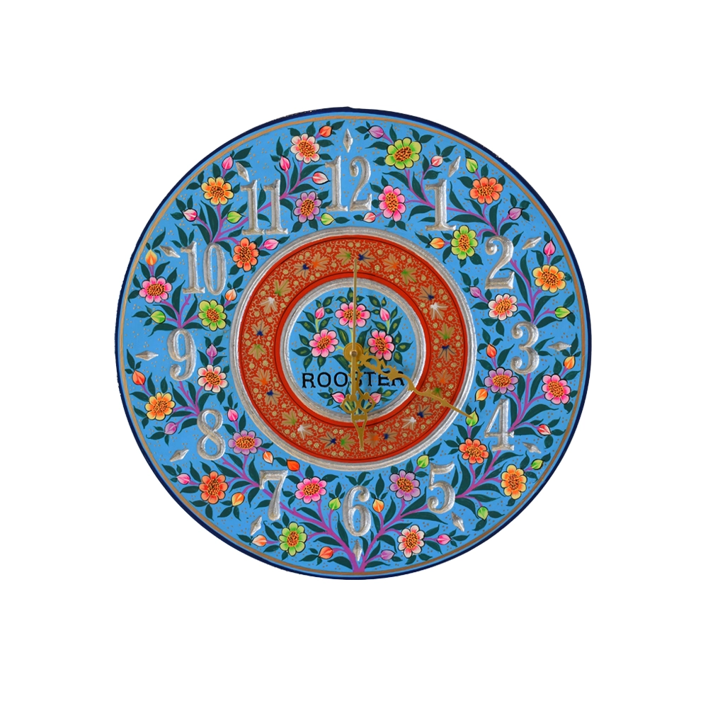 A round wall clock made of paper mache art is a timekeeper that essentially constitutes a paper mache painting design, a composite containing bits or pulp of paper within adhesive like glue. The clock often takes the form of a circle and it can be found in varying sizes, colors, and design patterns, these are hand-painted and decorated to make them more beautiful. It normally contains numerals or markers on its face and has clock hands indicating the time.